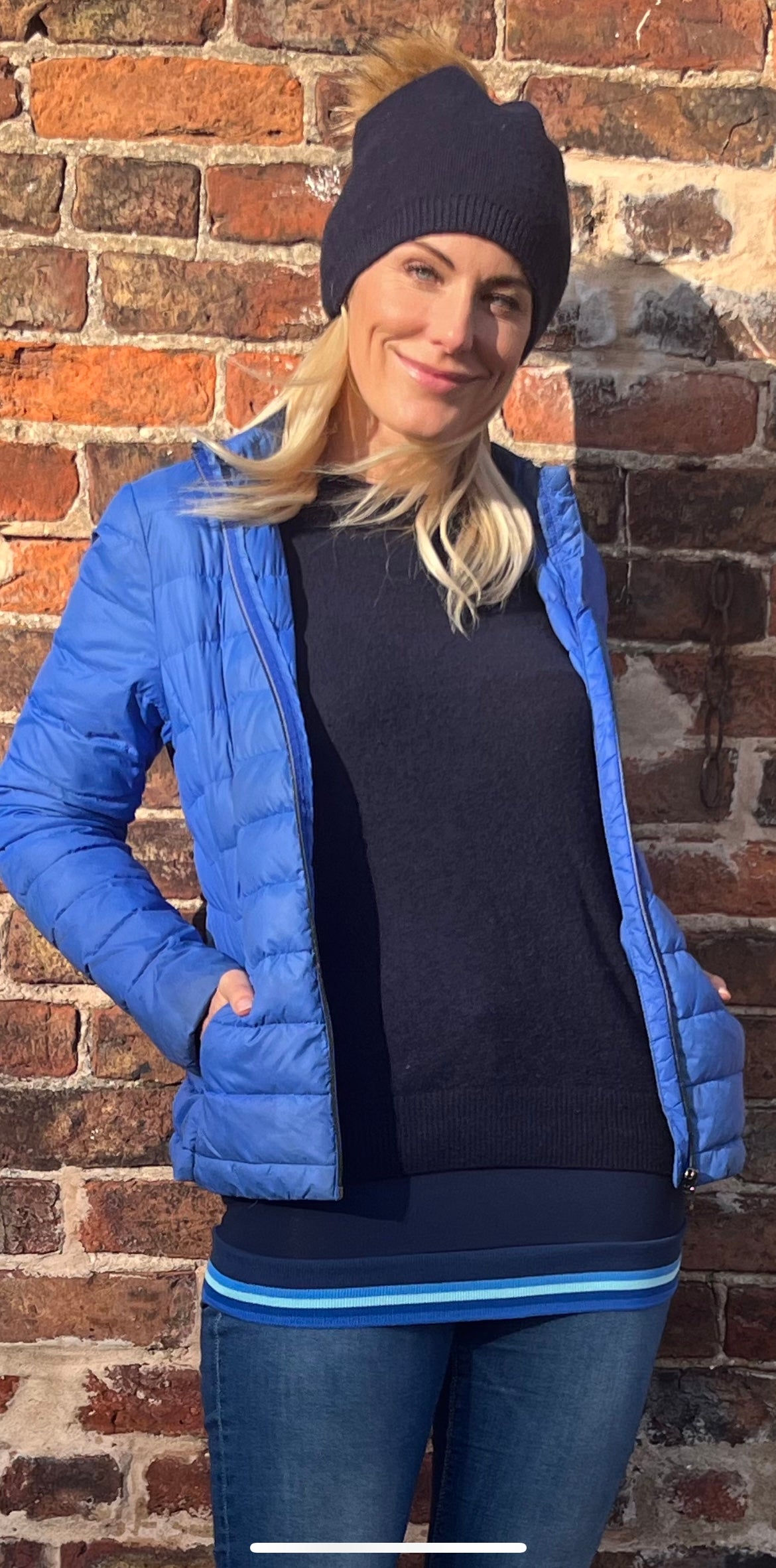 A stretchy navy band made up of Meryl and Lycra which provides comfort and support trimmed with striped blue and light blue material.